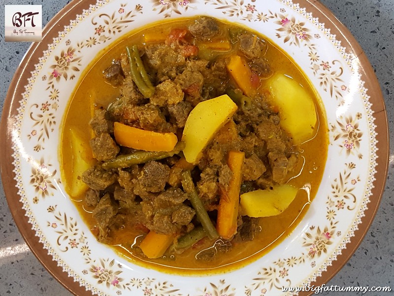 When I’m half done cooking this dish, my two little kids come trotting into the kitchen sniffing and drooling like puppies. They won’t leave me alone until their tummies are full. They like it hot with rice and even the veggies disappear into their tiny tummies. I find the beef and vegetable curry a deft way to feed them a lunch full of carbs, fiber and protein power-packed with iron, zinc and B Vitamins with no use of oil or ghee.