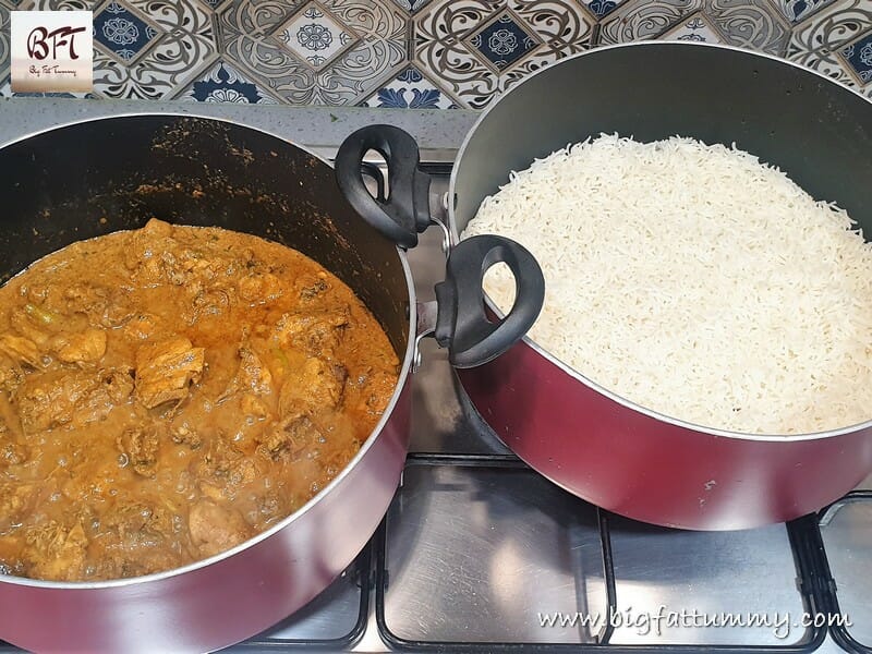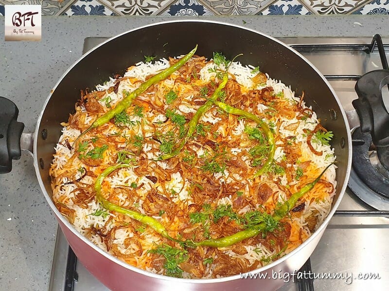 Step 6: Place a flat griddle (tawa) on your stove. Place the vessel containing the assembled biryani on the griddle. We do not want the heat to reach the vessel directly and the griddle will help spread the heat uniformly. Cook on high heat for 5 minutes. Cook for another 25 minutes on low heat till the steam starts escaping.