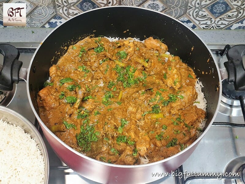 Step 4: Take another large pot / pan and spread half the rice in it. Then layer it with all of the chicken gravy. Sprinkle 2 tbsp. corriander leaves.