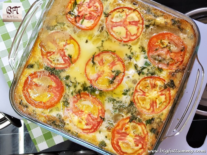 Step 4: Set your oven to pre-heat to 180°c. Meanwhile, spread the meat mixture evenly, in an ovenproof dish. Pour the beaten eggs over this mixture and spread evenly. Arrange the tomato slices over it and sprinkle some corriander leaves.