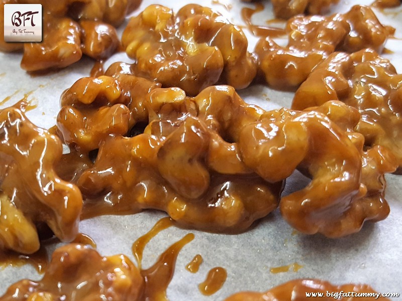 Step 2:     Heat a pan. Add the butter. Once the butter starts melting, add the honey and the walnuts and mix well on medium heat. Keep on mixing well till the honey starts caramelizing and coating the walnuts. This will take 8 to 10 minutes.