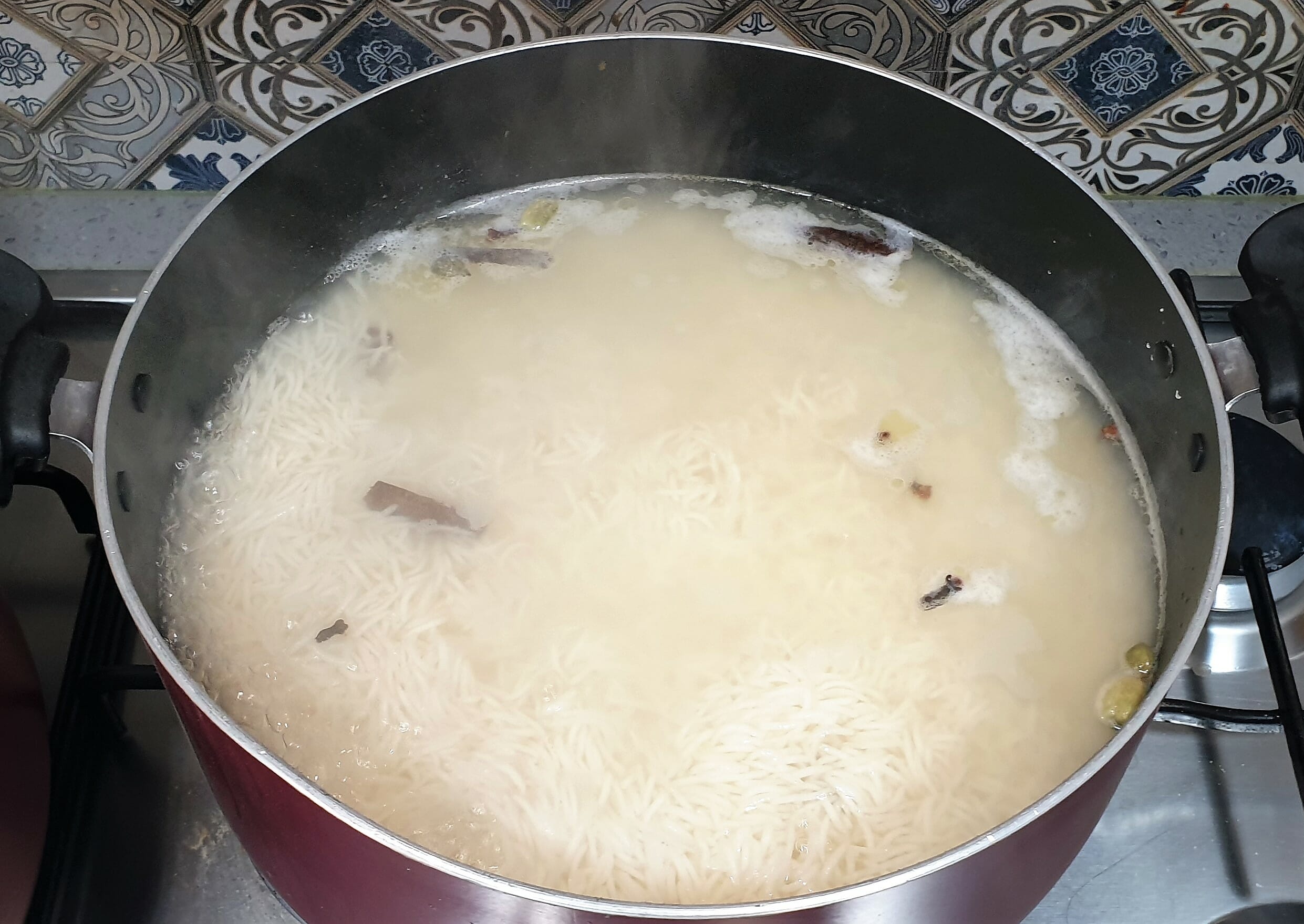 Step 2:     Fill the pot with the water and add salt, oil, and all the spices and bring it to a boil. Add the drained rice and cook for 5 to 6 minutes till it is half done. Drain the rice immediately, spread on a large plate and allow to cool. Remove the mace from the rice and keep aside.