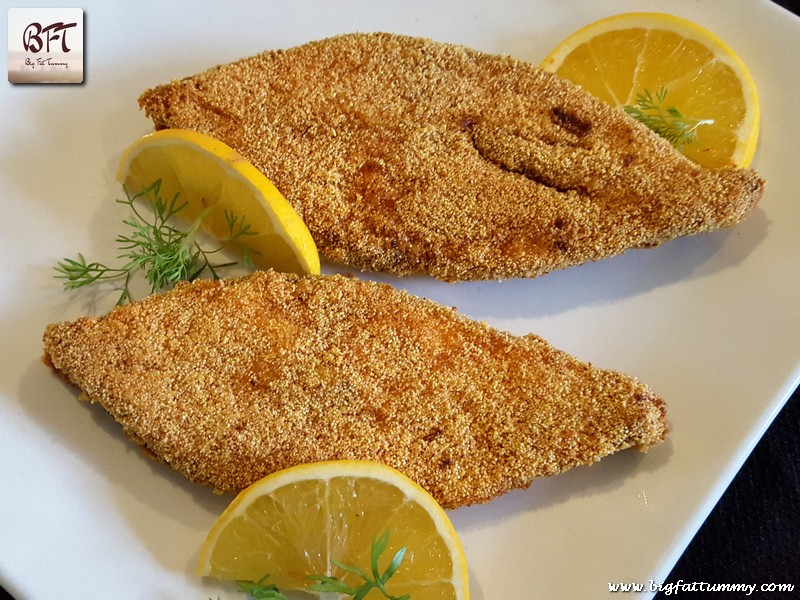 Step 2: Take semolina in a flat plate. Coat the fish slices with the rawa. Leave aside for 5 to 10 minutes so that the semolina swells and you get a nice coating.