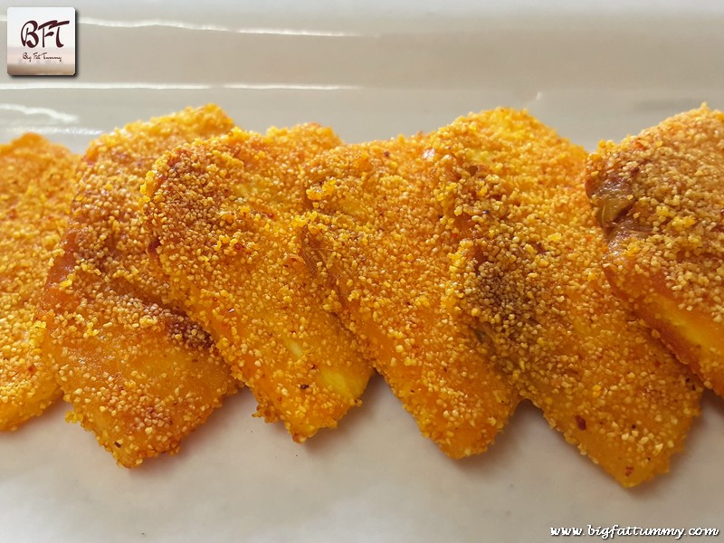 Step 4: Heat the oil in a frying pan. Take each well coated slice of bread fruit and place on the pan. Fry on low heat for 6 to 8 minutes on each side till the coating is crisp and the breadfruit cooked.