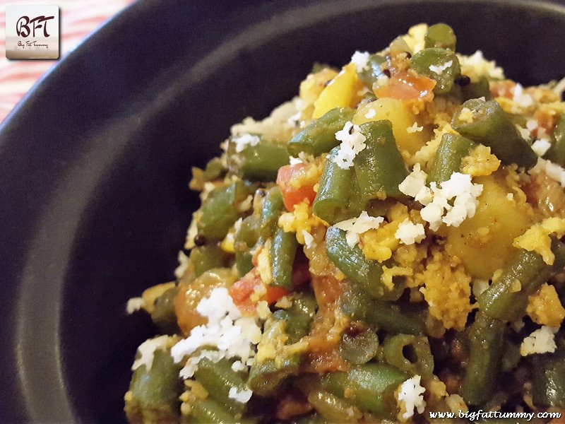 The French Bean Potato Bhaji is a dry preparation. It is quick to make and can be served as a side with rice or you can eat this with chapatis or rotis at dinner time.