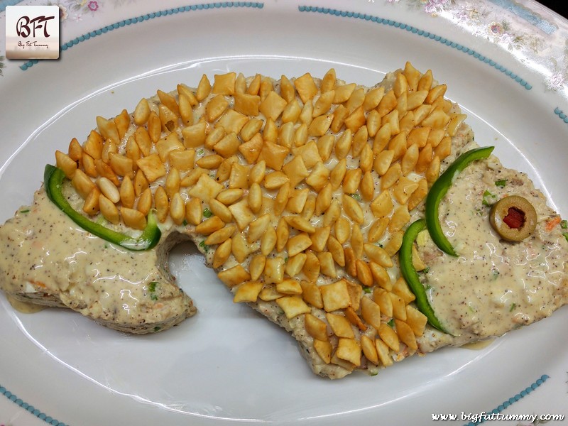 Step 6: De-mould the mixture on a suitable plate. Apply mayonnaise lightly all over it. Mark out the portion for the head and tail. Use pieces of capsicum on the marks and place cheeselings all over the body of the fish to give it an appearance of scales. Use ½ of an olive for the eye.