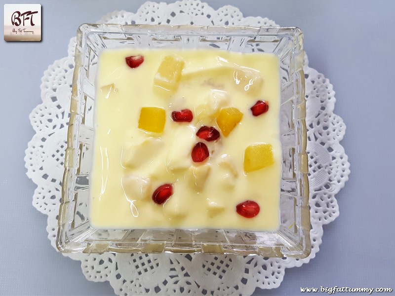 Step 5: Refrigerate the custard for 2 to 3 hours and then add the chopped fruits to it and mix. Cool it further for at least 2 or more hours before serving.