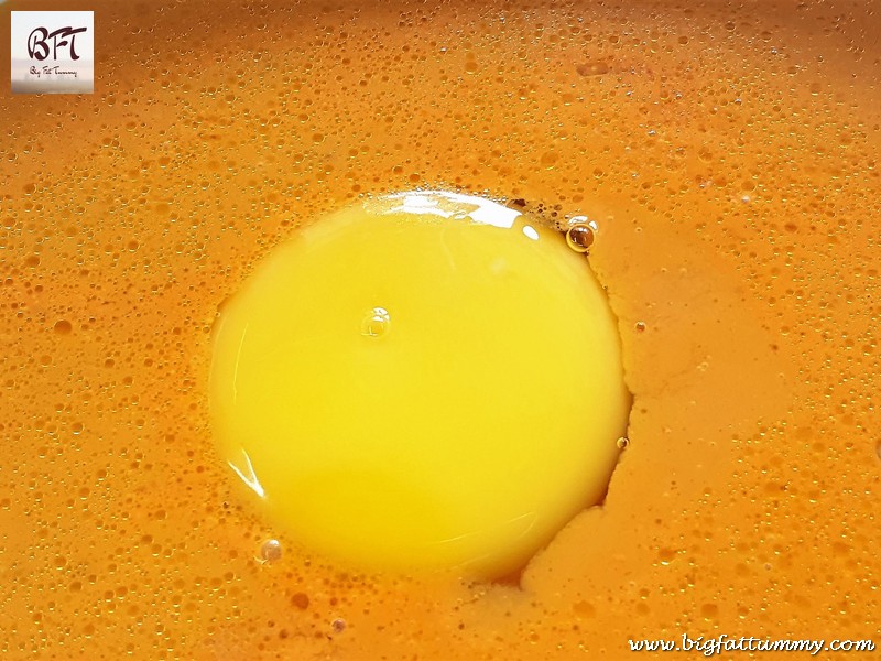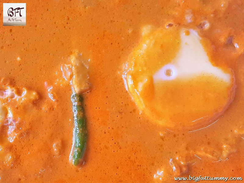 Step 3: Bring the curry to a boil and then lower the heat. Break an egg and slowly lower it into the curry. Spoon the hot curry over the egg till it develops a form. Do this for all the eggs. Half cover the vessel and let it cook on medium heat for 2 minutes. Do not use a ladle to stir.
