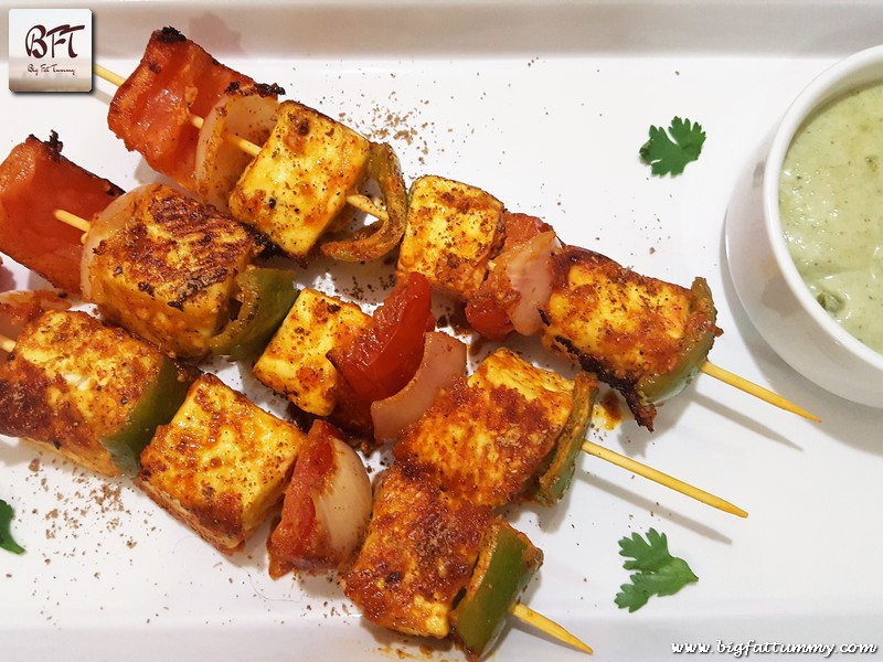 Make these cottage cheese tikka’s without a barbecue, on a griddle. You can serve the paneer tikka on the stick like a shashlik or take them off the stick and serve them with a salad and green mint chutney and a sprinkle of chaat masala.