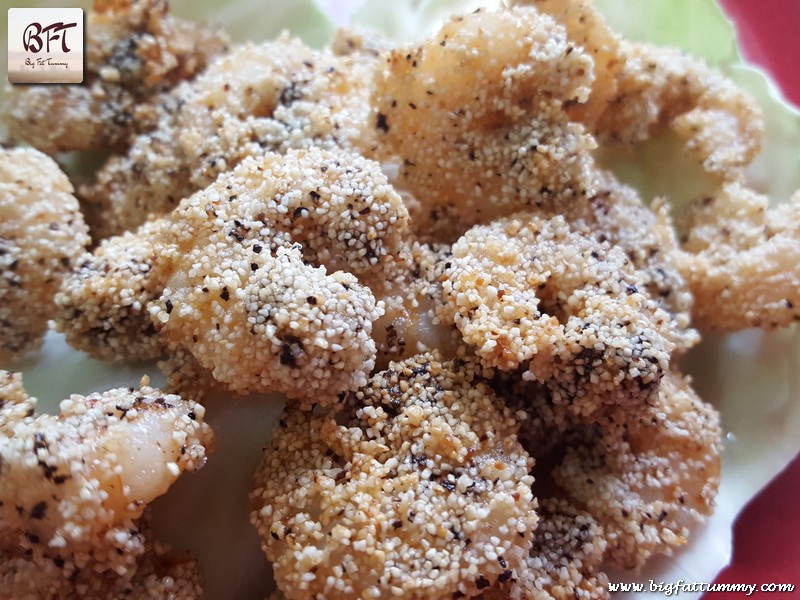 The Pepper Rawa Fried Prawns get their flavour from the pepper and prawns and the crunch from the deep fried coating of semolina. These are an all-time favourite of people of all ages. My boys just love them. They can be served as a starter, a snack or as a side.
