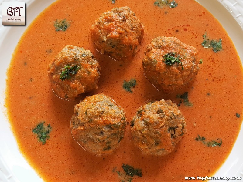 Step 6: After the koftas are done transfer them to the gravy, mix lightly and simmer uncovered for 5 to 6 minutes. Check for salt and add if required. Later switch off the heat, wait for 5 minutes and then add the milk cream and stir it in. (be careful not to break the koftas while stirring) Garnish with corriander leaves.