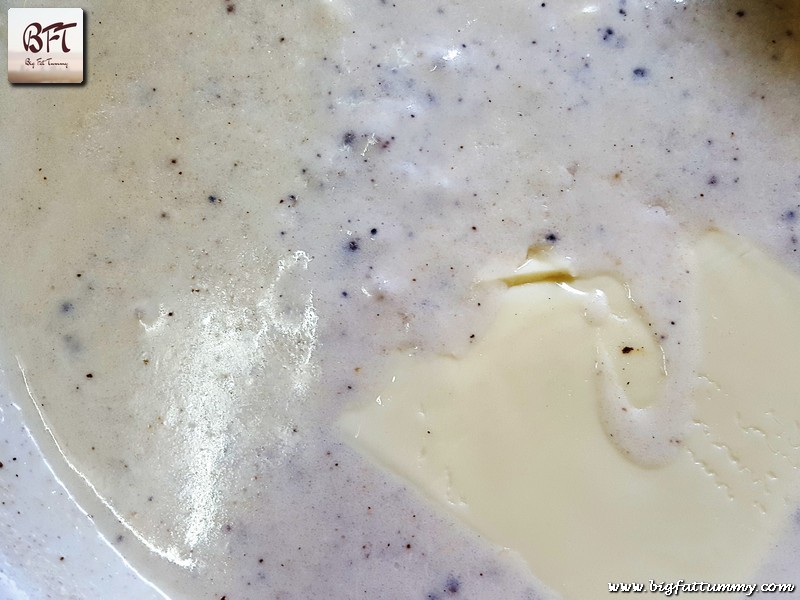 Step 1:     Place a pan on low heat and melt the butter. Add the flour and stir continuously with a whisk / wooden spatula till the colour changes slightly (do not let it brown).