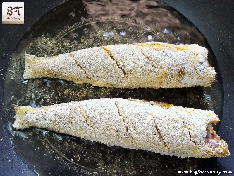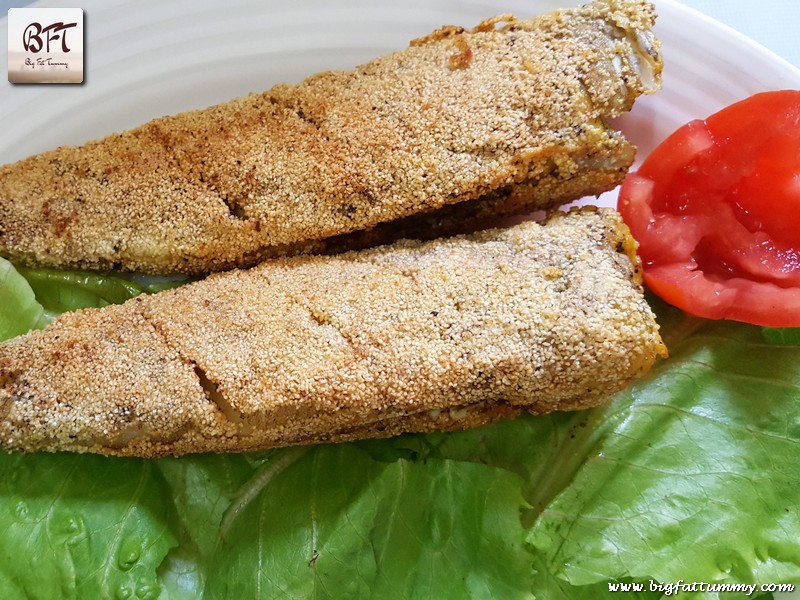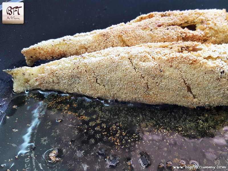 Step 4:     Roll each fish in the rawa-rice flour mixture and shallow fry on each side for 3 to 4 minutes till the fish is nice and crisp.