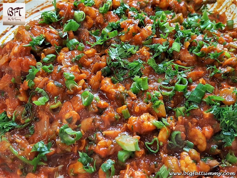 Step 4:     Next add the marinated prawns and sauté for 5 to 6 minutes. Add the spring onion greens, green chillies and ketchup. Give the prawns a quick stir and cook for a minute. Switch off the heat and throw in the corriander leaves. Mix and allow to cook.