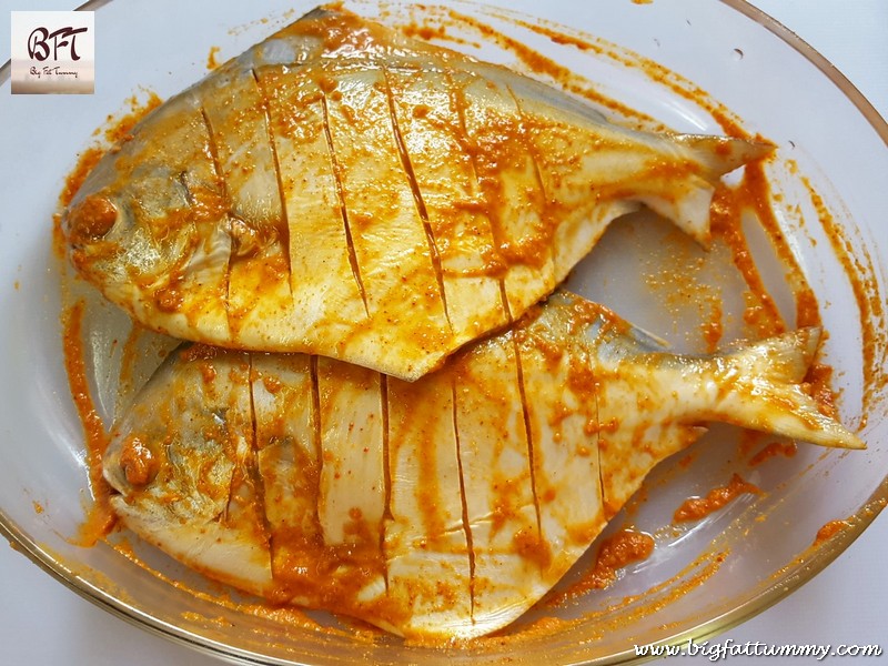 Step 1: Keep the pomfret whole but cut off the fins and tail and clean all the innards. Wash and drain the pomfrets. Make a few deep incisions on both sides of the fish.