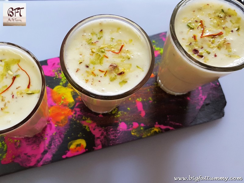 Piyush is a refreshing sweet drink, kind of like a thick shake made with hung curd and buttermilk. It is very good for the tummy (the probiotics). Enriched with pistachios and saffron, the piyush is to be served cold, as a pleasant summer drink.