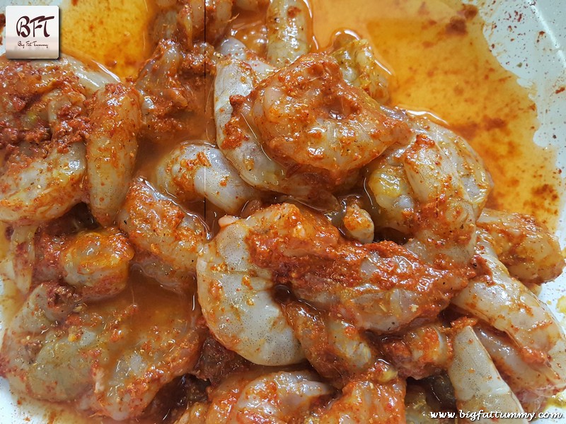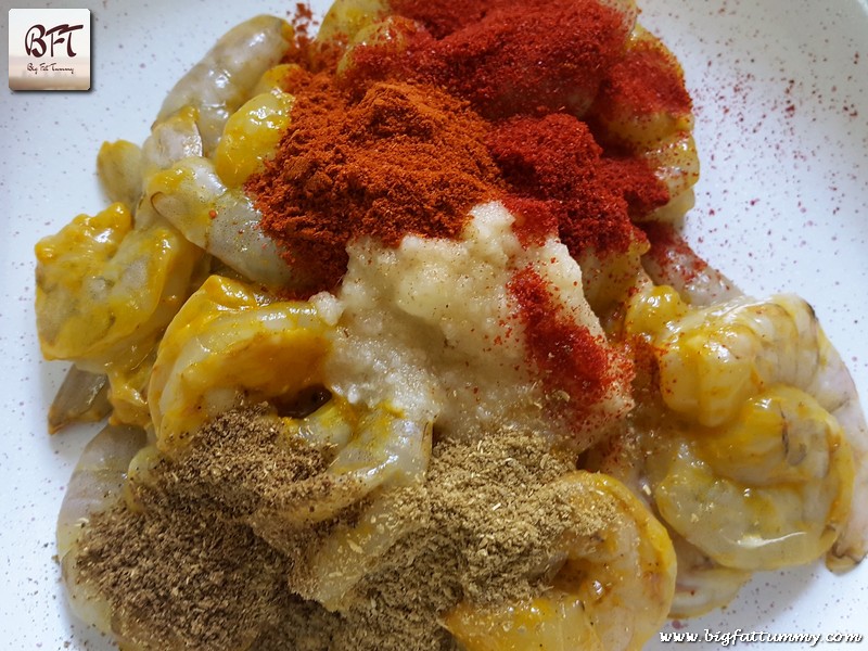 Step 1:     Shell & devein the prawns. Wash them and drain well. Apply salt and turmeric powder and leave aside for 10 minutes.