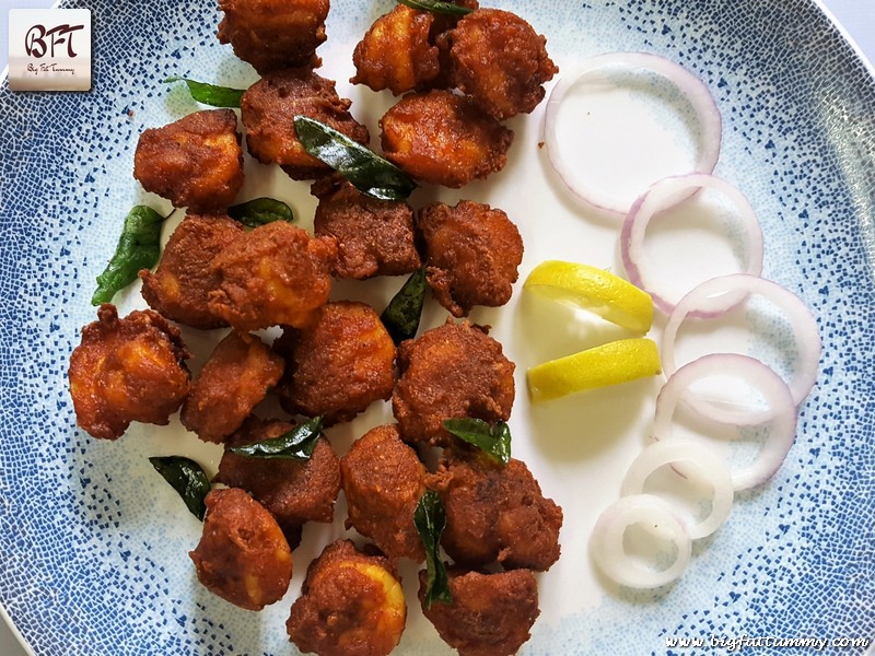 This is the Tamilian version of Prawns 65. The prawns are semi-pre-cooked with spices before they are deep fried. Since the raw prawns are cooked in the masalas, the flavor and the masalas adhere to the prawns and make them more flavourful even after they are deep fried. However, do deep fry the prawns for more or less the time mentioned in the recipe as we do not want the prawns to lose their juiciness.