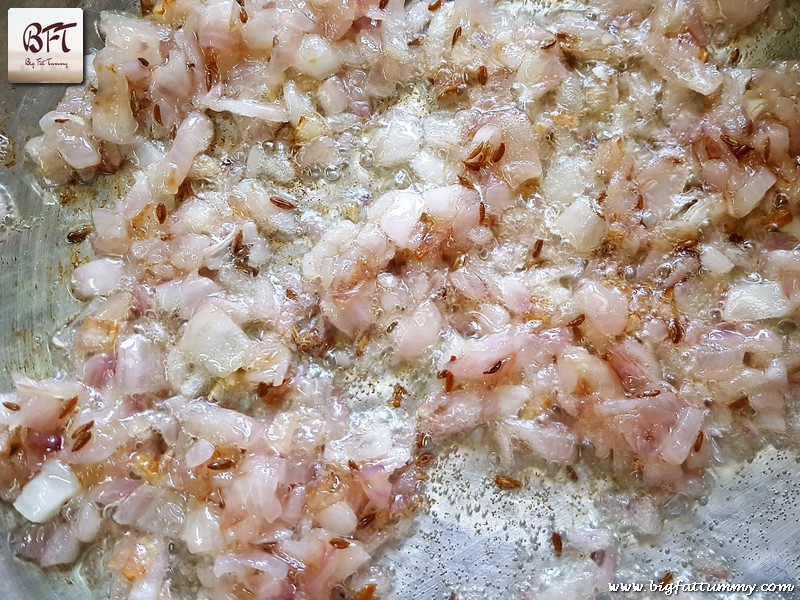 Step 2: Heat the oil in a pan and add the cumin. Once aromatic, add the chopped onions and fry till light golden on low heat.