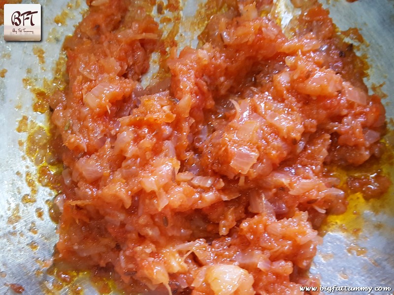 Step 3: Add the ginger-garlic paste and sauté till the raw smell disappears. Next add the pureed tomatoes and cook till oil leaves the masala.