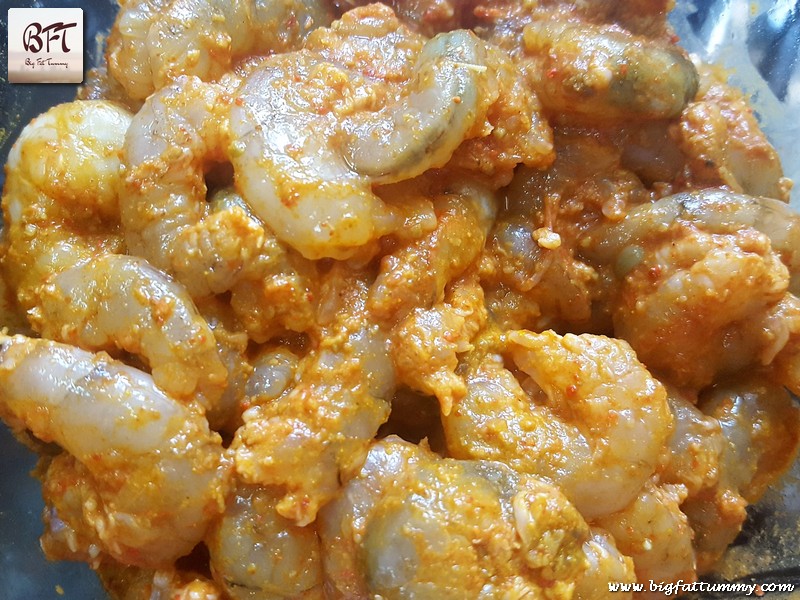 Step 1: Marinate the prawns with ½ tsp. salt and the ingredients listed under marinade and keep in the refrigerator for at least 30 minutes.