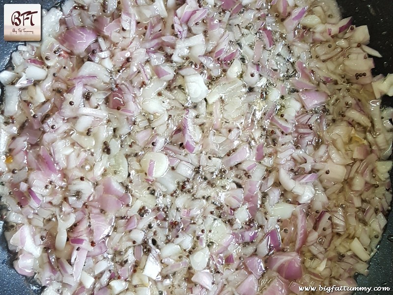 Step 1: Heat the oil / ghee in a pan large enough to accommodate the rice. Throw in the mustard seeds and when they splutter add the garlic and sauté for a few seconds on low heat. Add the onions and sauté till it changes colour and becomes soft.