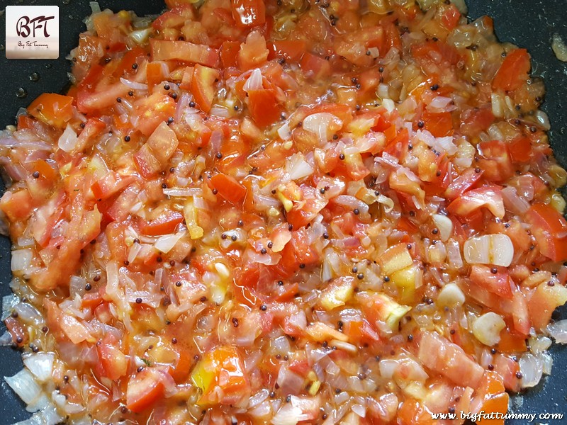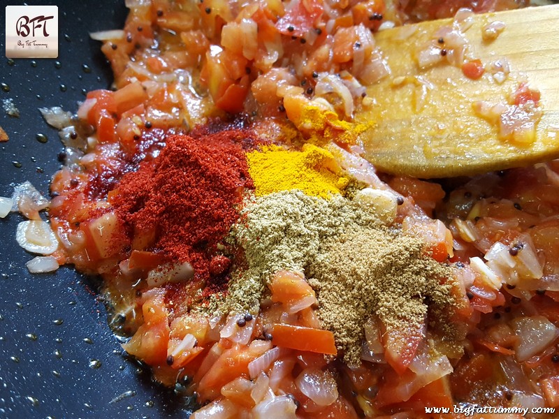 Step 2: Next add the tomatoes and sauté for a minute. Add the spice powders and cook till the tomatoes are soft.