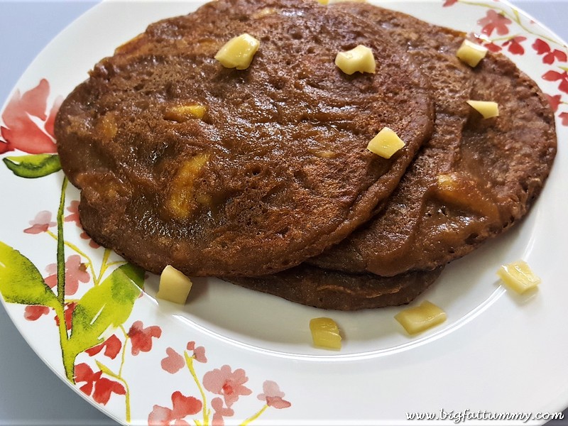 Step 4: Heat a pan and grease with ¼ tsp. ghee. Mix the batter and pour a ladle-full of the mixture into the pan. Cook on medium heat for 1 to 1 ½ minutes or till you see the sides browning and small bubbles forming on the top side. Flip over and cook for another 1 ½ to 2 minutes on medium heat till done.