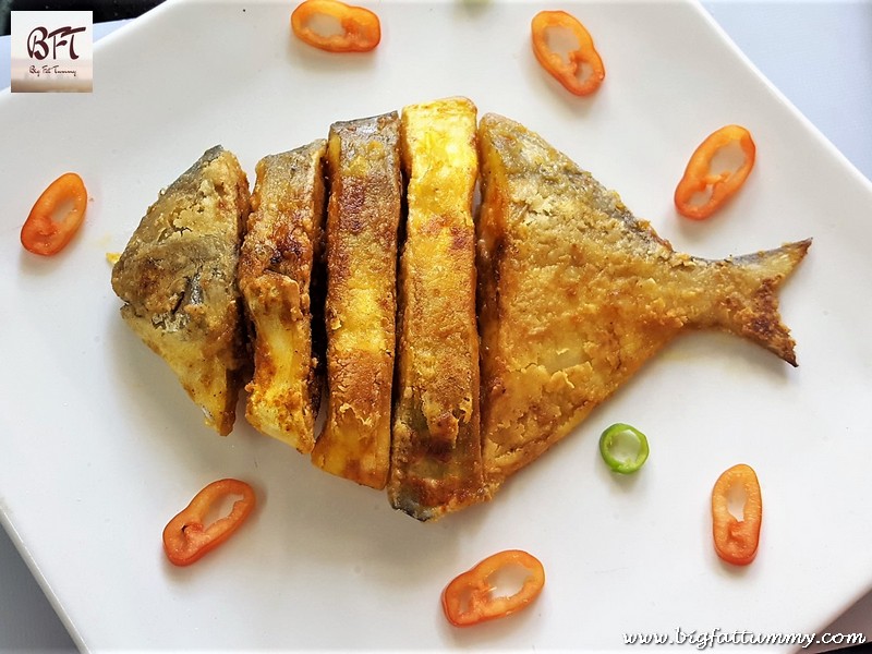 Step 4: When the oil in the pan has heated, dust off extra flour off the fish and fry all sides on medium heat till crisp and light golden.