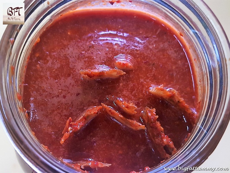 Step 5: Add the remaining vinegar to the spice paste and mix. Pour the masala slurry into the glass jar over the fish till all the fish are completely immersed in it. Use more vinegar if you fall short.