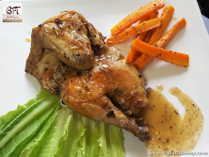 Step 10: Carve the chicken and serve with some herbed carrots and the sauce. Serve within 30 minutes of taking out from the oven so that it does not dry out.