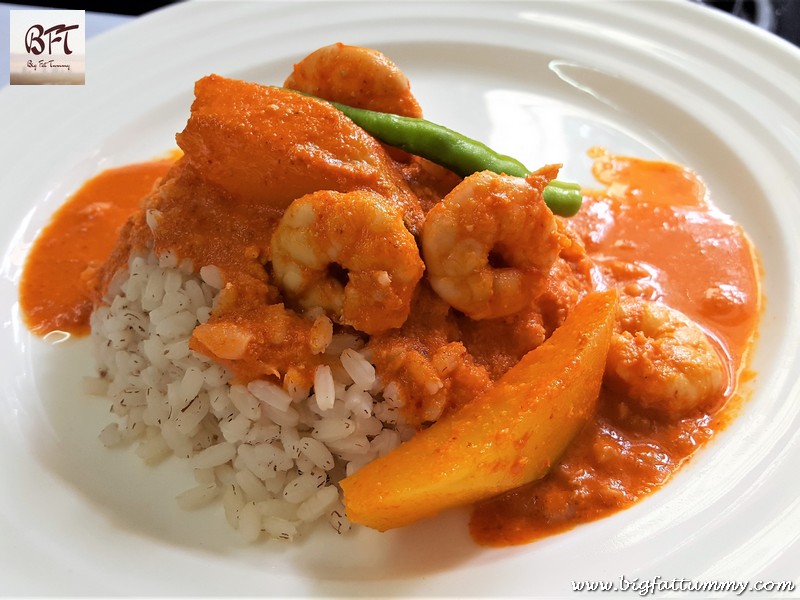 The Prawn and Raw Mango Curry is a Goan specialty made when mangoes are in season (you can also peel and store the raw mangoes in the refrigerator for later use). The curry is a mildy spiced and tangy coconut curry. The mango provides the acidity to the curry, while the prawns and coconut make the curry flavoursome and creamy. You can relish this lip smacking curry with hot rice and you will be left licking your fingers at the end of your meal (That is, if you eat with your fingers 😛 )
