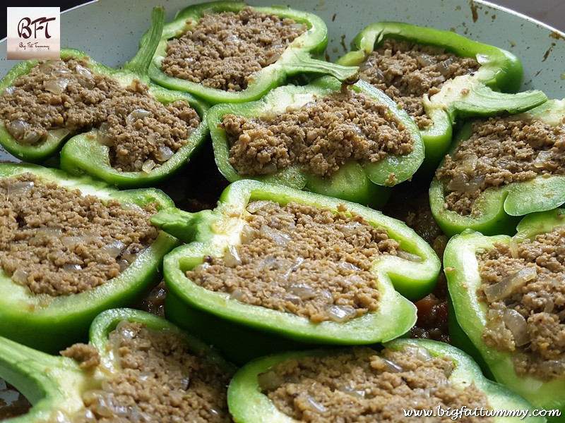 Step 8:     Arrange the stuffed capsicum in the pan. Drizzled a tbsp. of oil over it and cook covered on low heat for 15 to 20 minutes.
