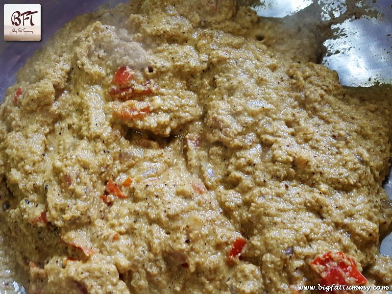 Step 3:Β Β Β Β Heat 3 tbsp. oil in a pan suitable to make the curry. Add the onions and saute on medium heat till soft. Next add the tomatoes and cook covered on low heat till the tomatoes are mushy (about 8 to 10 minutes)