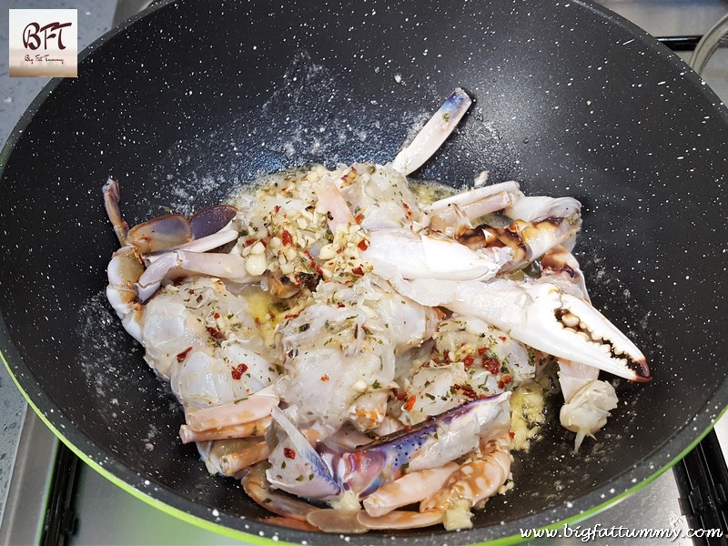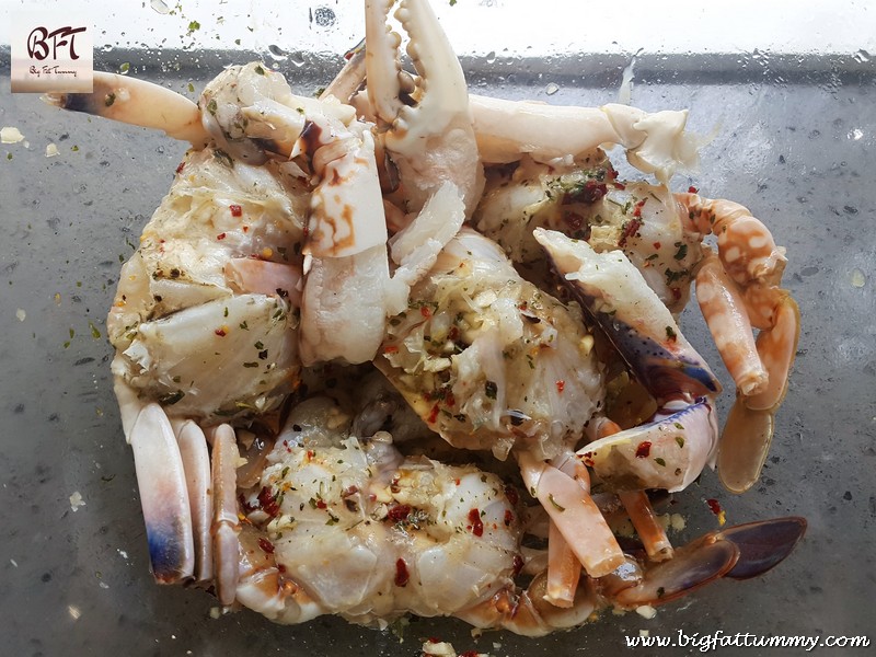 Step 2: Marinate the crabs with lime juice, pepper powder, garlic, half of the chilly flakes, 1 tsp. parsley, 1 tbsp. garlic and 1 tsp. olive oil. Leave aside for 15 minutes.