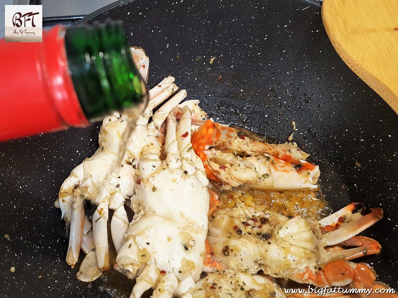 Step 4: Splash the white wine in the pan and continue cooking for another 3 to 4 minutes, stirring in between to dry off all the juices. Season with a pinch of pepper powder, the remaining chilly flakes and parsley. Turn off the heat and keep covered for 2 minutes before serving.