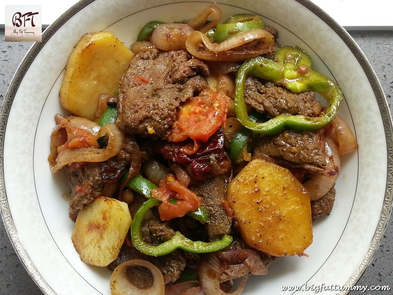 Step 9: Add the tomatoes to the meat and cook on low heat for 5 minutes. Finally add the fried potatoes, onions and capsicum and mix well. Serve hot.