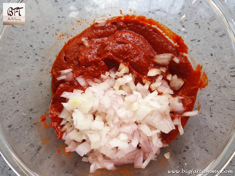 Step 3: Take the recheado masala in a bowl and add the finely chopped onion and mix well (taste the paste for seasoning and add if required).