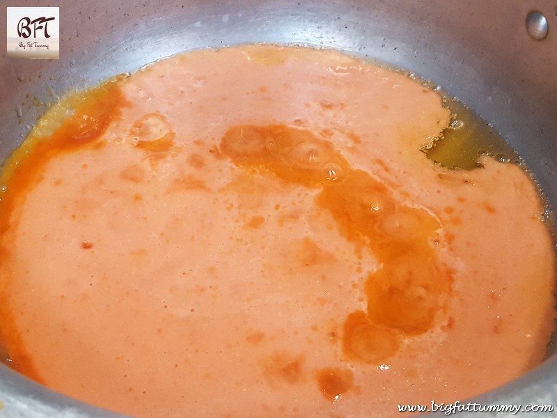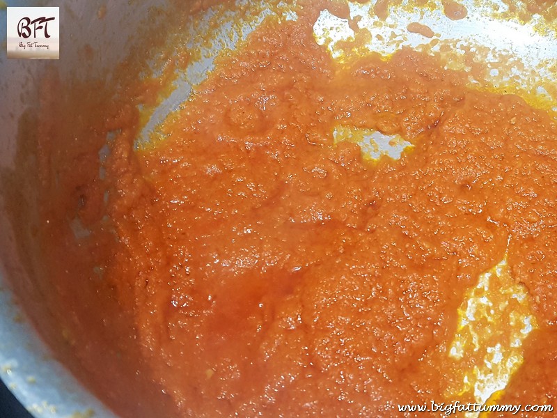 Step 3: Heat oil in a pressure pan/cooker and add the ground masala to it. Stir on medium heat for 10 to 12 minutes till the raw smell disappears and the oil separates.