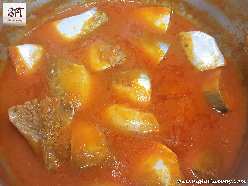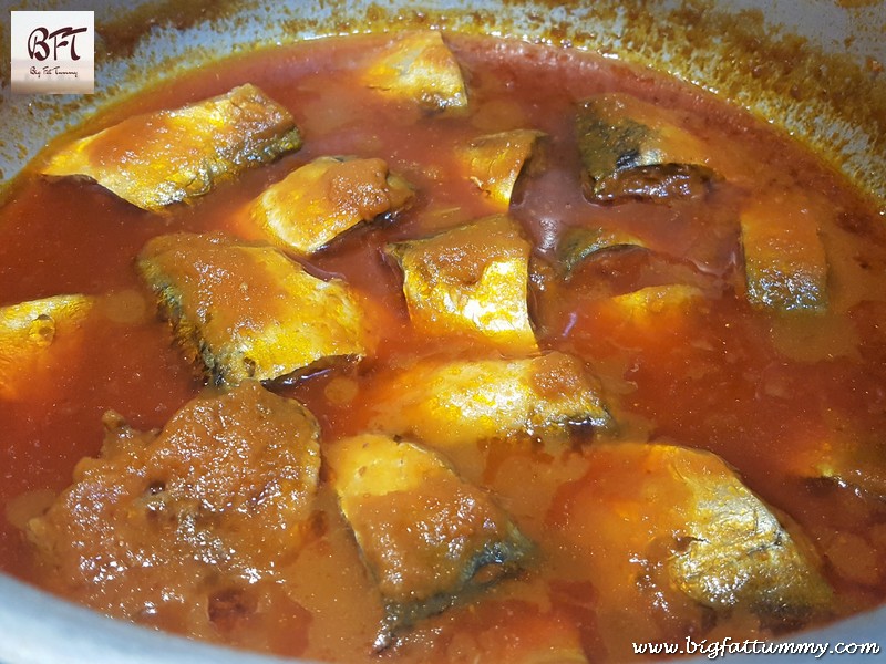 Step 4: Add ¾ cup warm water, vinegar and ketchup and mix well. Put in the mackerels and stir gently to coat them. Let them simmer for 2 minutes. Check for salt and add if required.