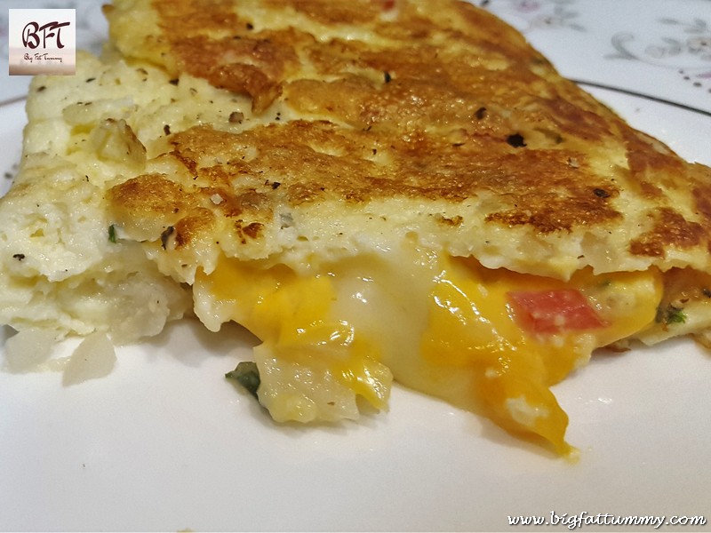 Step 4: Now sprinkle the cheese on one half of the omelette. And fold the second half over it. Sprinkle ½ tsp. of oil and cook till it sets / browns slightly and then flip it over carefully and let the other side brown slightly.