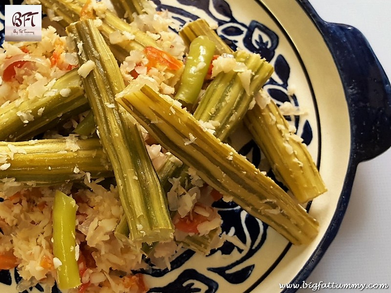 The Goan Moska Saanga Bhaji is a dry preparation of drumsticks. The vegetable is just steamed and the recipe does not use any spices. All you have is the natural taste of the drumsticks and a little coconut to add sweetness.