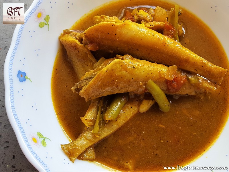 Step 5:     Finally put in the lady fish and the green chillies and cook uncovered on medium heat for 3 to 4 minutes. Once the curry starts boiling, swirl it once or twice in between (do not use a spoon). Serve with hot rice.