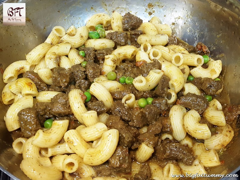 Step 8: Open the lid of the pressure cooker and switch on the heat. Add the pasta and peas to the cooked meat. Add the butter and mix well gently. Cook for 5 minutes on low heat.