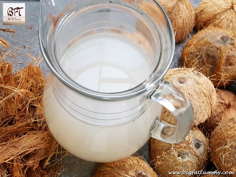 Step 1:     Strain the coconut water into a clean glass or plastic jug/vessel. Add 10 tbsp. sugar and mix well till the sugar has completely dissolved (Check for sweetness. The water should taste sweet. Add more sugar if required)
