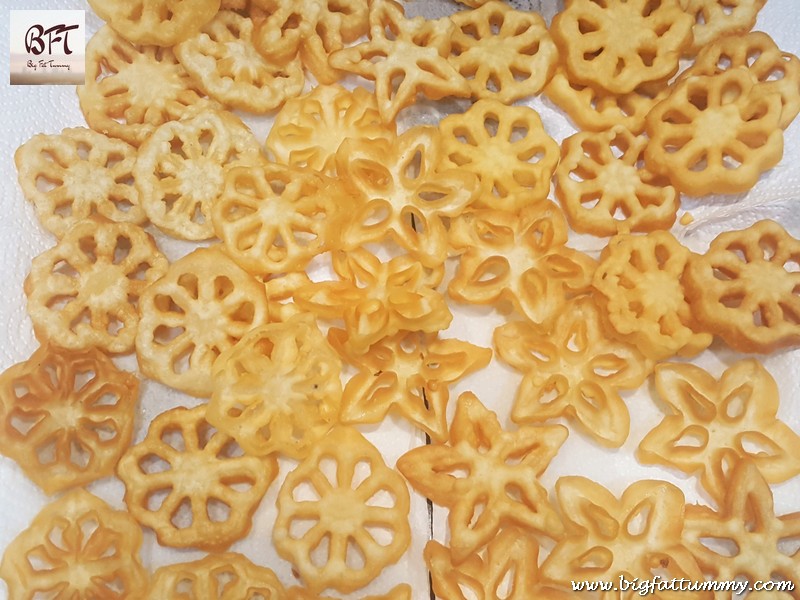 Step 5: Immerse the mould again in the oil, immediately after the first cookie has released. Count rapidly till 20. Then take the mould out and dab on the tissue. Than dip in the batter. Count till 20 rapidly. Immerse in the oil (continue this pattern till you have exhausted all you batter). Turn the cookies over once they have fried on one side using the rose cookie mould itself. Fry only 3 to 4 cookies at a time so that the frying temperature does not go down. When done on both sides, remove them out using the pointed knife and place on the tray lines with kitchen tissue.
