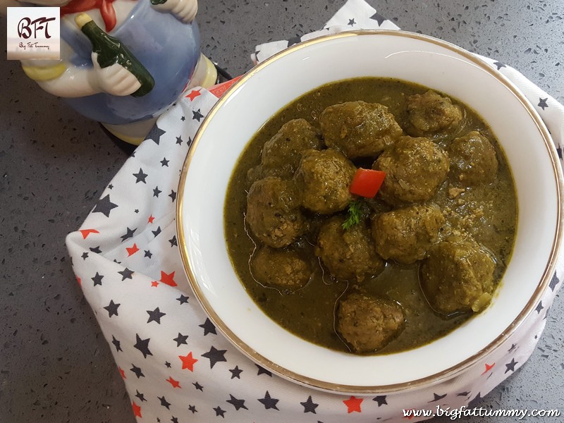The Green Meat Ball Curry is a variation of the Meat Ball Curry (see here) I had posted earlier. This one does not use coconut milk and as the name suggests uses a coriander based green masala. The mince for this one was prepared at home and the texture therefore was so good that it was hard to differentiate whether they were made with beef or chicken. I recommend making the mince at home as we can make it with good, clean cuts of meat.