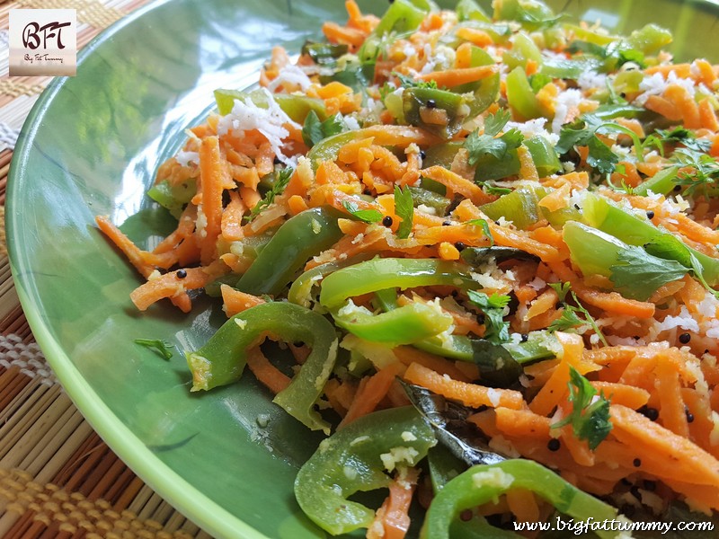 This preparation of Carrot and Capsicum is almost like a warm salad. It makes use of just mustard seeds and some herbs. It’s very easy to make. In fact cleaning and cutting the vegetable will take more time unless you use a food processor or vegetable grater. The Carrot and Capsicum is perfect for when you’re trying to cut calories or going on a vegetarian diet.