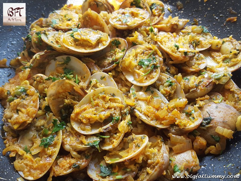 Step 3: Add all the powdered masalas and cook for another minute on low heat. Then add the clam halves, another 2 tbsp. of green corriander and mix well. Add the grated coconut, sugar and salt and mix lightly.