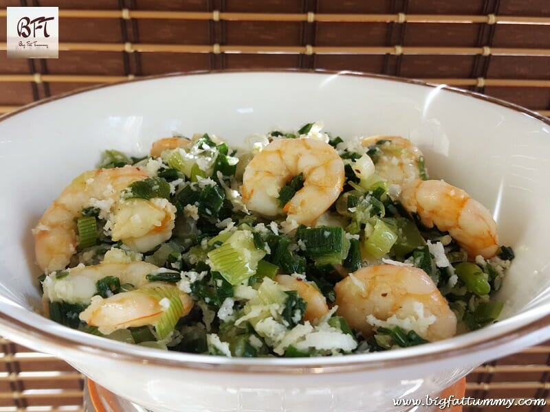 As simple as can be, the recipe for this Spring Onion Bhaji with Prawns was shared to me by my friend Betty Pires. It is a bhaji preparation where the prawns retain their flavours and the crunchy spring onions complement the prawns well. It can be served as a side or eaten with chapatis.